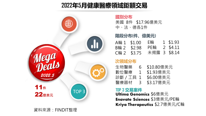 三、全球健康醫療領域鉅額投資交易統計-2022年5月
