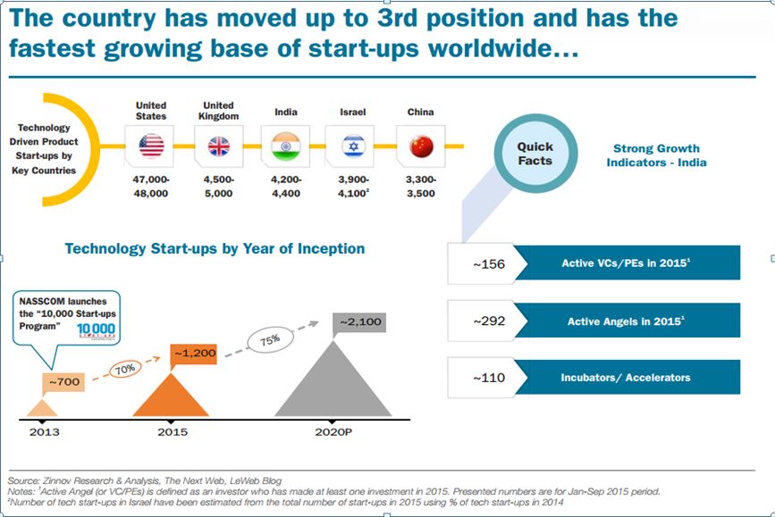 依據全球IT服務、諮詢和商業解決方案供應商Zinnov的調研顯示,截至2015年美國擁有4.7萬家科技創業企業,英國則為4,500家,印度約為4200家,印度成為僅次於美國和英國的世界第三大科技創業企業聚集地。技術的革新推動印度企業創立,加上2015年8月,印度總理穆迪發佈了”Startup India”計畫,除提供15億美元的創業基金外,在稅收優惠、信用擔保基金、創業企業快速註冊和退出服務外亦羅列出實質的做法與放寬標準。