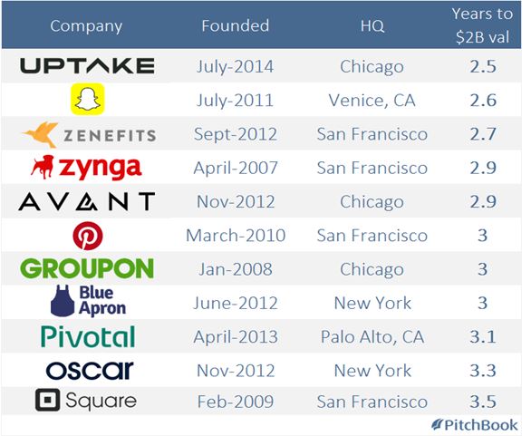 PitchBook最近統計美國在2015年(含)以後獲投後估值達20億美元的新創企業名單,列出11家從成立後估值最快到達20億美元的名單,包括:Uptake、Snap、Zenefit等。