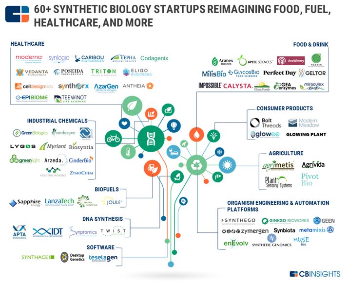組織工程與自動化平台(Organism engineering & automation platforms): 這類的新創企業正在建構軟體與硬體解決方案,加速合成DNA生產的規模化。組織工程主要是致力於組織和器官的再生與形成,利用材料科學與生物科技的進步,在一個模仿組織與器官形狀的材料中種入細胞,使細胞依著模型來長成新的組織與器官,以供修復人體的組織缺損。如Ginkgo Bioworks已經建立了一個自動化組織設計系統,讓科學家在很短的時間中,完成數以千計的基因設計原型。MetaMixis也設計了一個平台,發現生產各種化學品的新穎路徑,使科學家們能夠更快地編程微生物來產生化學品,例如在香料或香料中使用的化學品。