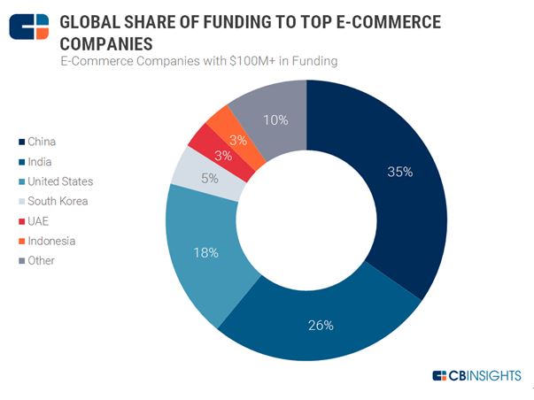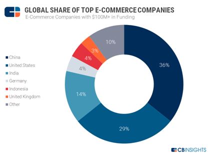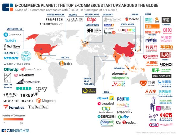 中國排名第一,有25家獲投超過1 億美元以上電子商務公司,包括 折扣平台巨人China Internet Plus (美團-點評),近二年共獲投33億美元。另外一家是趣店(之前稱為去分期),為一家向年輕人提供分期消費的金融服務平台,主營3C、運動戶外、美容美妝、服飾等類目,可無信用卡與擔保享受分期購物,募資超過9.6億美元。2016年7月由北京鳳凰財富控股集團旗下的鳳凰祥瑞互聯網基金和A股上市公司聯絡互動領投,完成30億人民幣(約4.49億美元)的F輪投資。中國同時也是二手車交易平台投資的熱點地區,包括:優信、大搜車、人人車等8家。