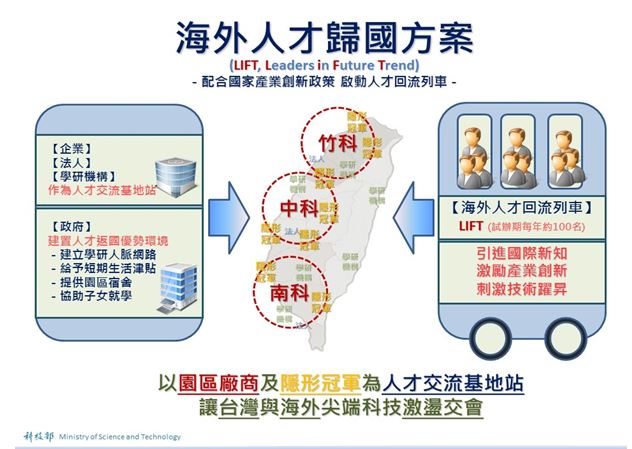 科技部繼推出「博士創新之星」,選送國內博士級優秀人才至美國矽谷實地參與前瞻技術研發計畫之後,為響應政府目前推出之「前瞻基礎建設」及「產業創新領域」等政策推動,並呼應海外人才歸國的期待,以及台灣產學研各界對海外前瞻應用及稀有領域人才之渴求,科技部又一次啟動人才列車,打造「海外人才歸國方案(LIFT, Leaders in Future Trend)」,號召台灣赴海外留學的人才,返國貢獻所學,將其國際視野、科技研發新知、前瞻應用趨勢帶回台灣,與國內的產學研界進行深度交流,期望透過引進國際新知,以達激勵產業創新,刺激技術躍昇之成效。希望藉由有系統的人才選送、培育、回流,讓優秀人才生生不息,為我國科研發展與產業創新,持續注入新的動能!