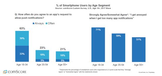 該報告發現千禧世代有許多沉迷於app的跡象,因此對於有高達63%的比例總是/經常同意app推撥訊息,遠高於其他兩個年齡層,或許是基於害怕錯過某些新奇好玩的事物(FOMO)的心理;然而,他們卻有高達71%的比例對訊息感到厭煩,但這也只能怪自己了。