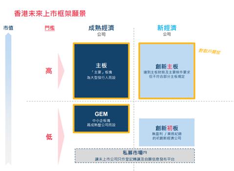 儘管香港在過去八年中有五年均名列全球首次公開招股集資額榜首,但香港市場仍存在不足,使得好些內地新經濟行業及其他高成長型公司選擇到其他市場上市。創新板框架諮詢文件提出的建議方案,旨在提高香港市場的競爭力,吸引有以下一項或多項特點的新經濟公司。香港目前的市場機制並不接受這些公司上市:(a)尚未有盈利的公司;(b)採用非傳統管治架構的公司;及(c)擬在香港作第二上市的中國內地公司。