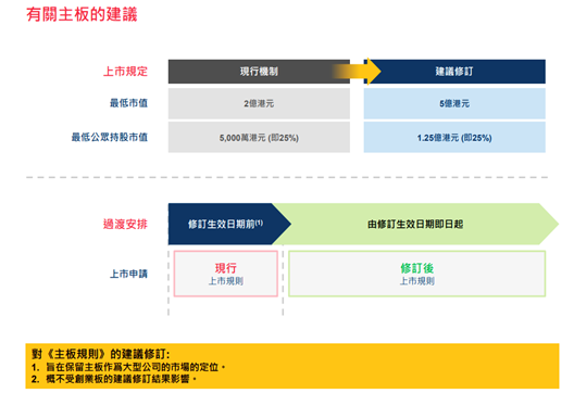 (d) 主板申請人預期最低市值要求由2億元增至5億元,主板公司的最低公眾持股市值也相應由5,000萬元增至1.25億元(5億元的25%);