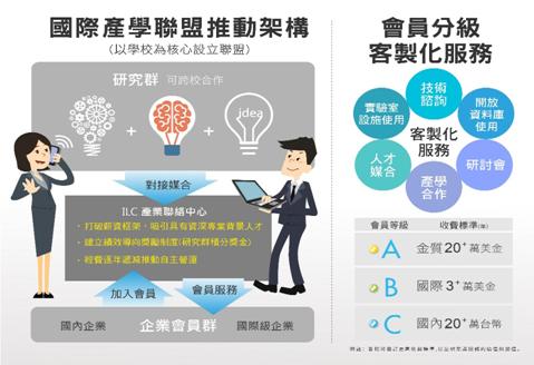 在會員分級部分,將建立分級會員加盟制度,提供客製化產業服務,深化大學的學術服務有價化的理念。例如收取會費金質會員20萬美金以上、國際會員3萬美金以上、國內會員20萬元以上,依會員的不同等級提供技術諮詢、研討會、產學合作、人才媒合、實驗室設施使用等客製化的會員服務,或是將會員企業的研發團隊送到校園內,與學校的研究團隊進行合作研發,讓所有會員得到尊榮且量身訂做的服務,並協助臺灣的學校在提供知識服務給企業的過程中,提升科技研究的新價值。