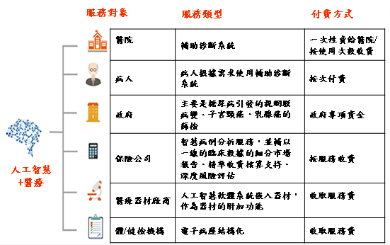 醫療人工智慧企業服務的對象可區分為:醫院、病人、政府、保險公司、醫療器材、體/健檢機構等,提供輔助診斷、視網膜病變與癌症篩檢、保費與理賠的風險評析、軟體服務、電子病歷結構化等服務,按次收費、一次性賣斷收費、收取服務費、向政府申請專案經費等收費方式。