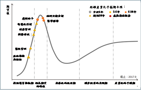 醫療人工智慧企業的蓬勃發展,也正是說明了人工智慧的商業化應用正在逐漸接近成功。至於醫療人工智慧不同細分領域的發展情況與市場應用區別有多大?技術成熟度如何?中國動脈網蛋殼研究院嘗試利用Hype Cycles 技術成熟度曲線來衡量。依照(1)該細分領域企業的平均投資額;(2)該細分領域的企業數量;(3)該細分領域的行業分散度;(4)該細分領域商用的醫院數量,得出醫療人工智慧技術成熟度曲線圖。