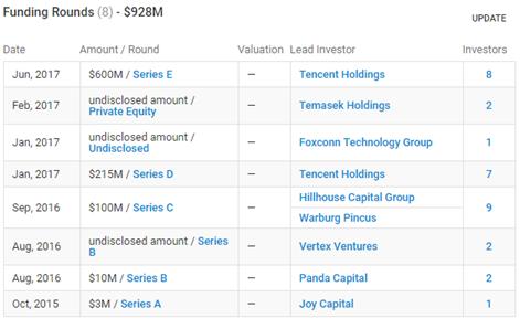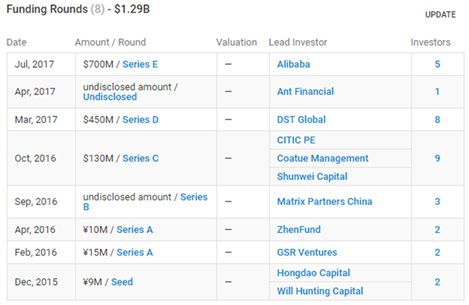 中國媒體分析,中國互聯網領域可分為京派、滬派、深派,北京向來是企業總部的聚集地,京派公司戰略著眼全國,重視市場以量取勝;滬派因上海為金融重鎮,細膩重利益;至於深派,因深圳製造業起家,因此重品質(如小藍單車)。由此脈絡可看出共享單車主要巨頭的背景及商業策略皆有所不同。巨頭之一ofo成立於2014年4月,產品正式上線時間為2015年9月。創立以來已募資八輪,所募金額達12.9億美元(如下圖),主要領投的投資方為阿里巴巴、螞蟻金服、滴滴打車等。ofo創辦人戴威認為以早階新創企業而言,擴張比防禦更重要,募資速度越快,越有掌控市場的潛力,產品優化可以之後再進行。事實上,擁有龐大資金做為後盾的ofo,以低成本為籌碼進行大量製造,自2016年Q4以來,每週的活躍使用者成長率達386%。