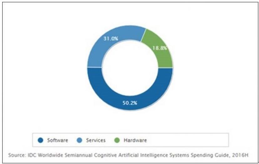 IDC 認為全球市場大部分認知和人工智慧 IT 支出近一半將用於 AI 軟體,包括認知應用和認知平台。 儘管 AI 軟體支出成長預計在 2019 年後有所減緩,但相關的 AI 服務支出預計將會穩步成長,達到 5 年複合成長率的 53.7%。AI 硬體將是成長最小,最慢的領域,年複合增成長率達 40.4%。