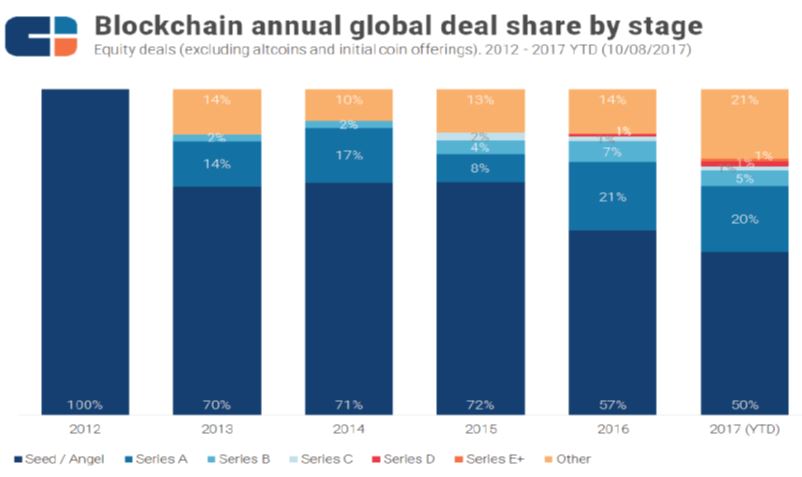 從傳統股權投資階段來看,隨著區塊鏈技術的持續發展,目前股權投資有逐漸朝向後期投資的趨勢。在2012年種子輪或天使輪股權投資件數占比還高達100%,2013~2015年占比雖下降,還維持70%上下,到了2016年下降至57%,而2017年前三季更是減少至50%。