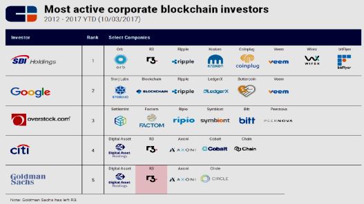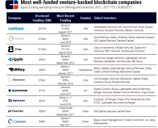 區塊鏈領域獲投最多的企業,虛擬貨幣交易平台的Coinbase排名第一,合計獲投2.17億美元,甫在2017年8月完成D輪1億美元的募資。第二名為ao美國的Circle Internet Financial為一家以比特幣區塊鏈為中心的 P2P金融技術公司。到2017年1月30日為止,歷經4輪股權投資,共獲得1.36億美元。第三名為美國加州舊金山的21 Inc,該公司的產品覆蓋比特幣採礦硬體到提升採礦效率的特製晶片,以及API應用程式交易市場。歷經2輪股權投資,共獲得1.21億美元,其中在2015年獲得1.16億美元巨額投資,為虛擬貨幣興起以來最大規模的一次募資。第四名為Ripple,2012年成立於美國加州舊金山,該家公司主要業務為採用區塊鏈技術為全球大型銀行解決金融交易問題,累計獲投9,400萬美元。第五名為俄羅斯BitFury,該公司最早為區塊鏈採礦硬體與晶片製造商,後拓展至區塊鏈基礎資料服務和交易處理服務。歷經4輪股權投資,共獲得9,000萬美元。