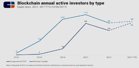 根據CB Insights《區塊鏈投資趨勢報告》資料顯示,投資至少一家區塊鏈企業的創投機構數量截至2017年3季已經達到95家,超過2016年全年的90家。2017年全年參與區塊鏈領域的創投機構可能達到120家。