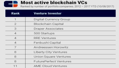 2012年到2017迄今(2017.10.8)投資區塊鏈最活躍的VC機構,分別為Digital Currency Group、Blockchain Capital與Draper Associates。