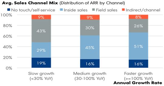 內部銷售為主要銷售管道-高速成長的SaaS企業,內部銷售方式占有較高的總銷售管道份額,而這類的銷售方式代表企業主動找尋正確的客戶,以及較短的銷售周期。OpenView的2017 SaaS Benchmarks資料顯示,高速成長的SaaS企業,其內部銷售就占了51%的銷售管道份額。