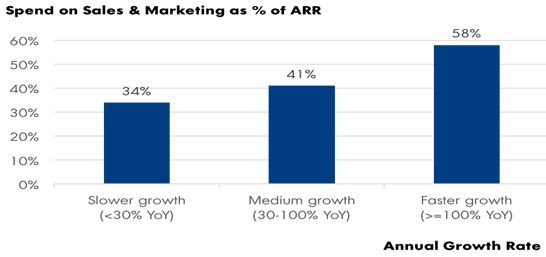 較高的市場營銷支出-隨著企業營收的增加,企業該做的事,就是花費更高的比例在市場營銷上,擴大市場能見度。資料上顯示,高速成長的SaaS企業,將其ARR的58%花費在營銷上。