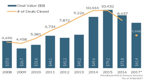根據PitchBook-NVCA Venture Monitor報告,指出美國創投產業投資的金額為614億美元,若按此速度,2017年美國創投投資金額將有望突破2015年高點,刷新紀錄。不過,投資件數則是連續二年下滑。