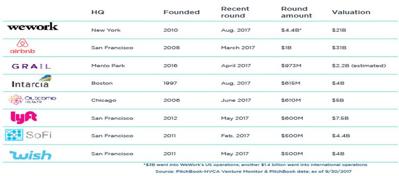 投資件數下滑,而投資金額上升,主要因有鉅額交易案件,2017年前三季共有8家金額超過5億美元的大型投資交易,也是創新紀錄,包括:共同辦公空間的wework、度假住宿短租平台Airbnb、癌症早期篩查的血液基因檢測公司Grail、波士頓研發第二型糖尿病植入藥物/裝置的Intarcia治療公司、健康科技平台Outcome Health、叫車服務的lyft、借貸平台的SoFi與矽谷跨境電商獨角獸Wish等,八家在2017年前三季科技獲投金額總額為96億美元,合計占整體獲投金額的15.63%