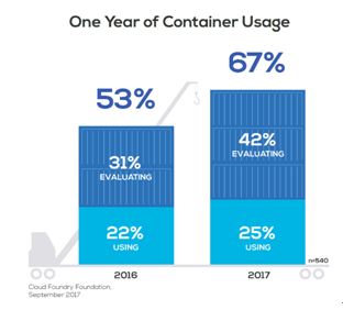 這樣的觀察,可由不久之前Cloud Foundry所發布的"Hope Versus Reality, One Year Later An Update on Containers"報告中獲得支持,雖然報告中較為保守地認為容器的使用還未真正的起飛。該研究透過問卷調查540家企業的開發者、運營人員、經理以及業務領導者,問卷統計結果顯示,2017年有25%的企業正在使用容器技術,另有42%的企業在評估與測試中;而此一數據在2016年分別為22%與31%。