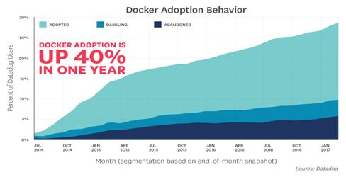 此外,雲端應用監控服務提供商 Datadog 所發布的全球 Docker 使用調查報告指出,Datadog的客戶使用Docker的情況在2016年至2017年增加了40%。該報告是透過來自10,000家公司的觀測紀錄。