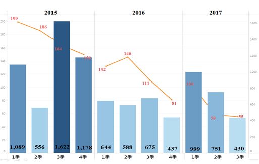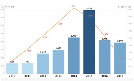 2016年受到資本寒冬影響,交易件數大幅減少近30%,全年僅有470件交易,成交金易則從2015年的44億美元減少到2016年的23.5億美元。2017年截至第3季為止,獲投案件持續下降至213件,但獲投金額已達21.8億,相當接近2016年水準。