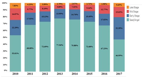 以投資階段來觀察,種子輪的投資比重有先升後降降的趨勢,從2010年開始種子輪投資一度到達2013年的77%,比重便一路下降,到2017年種子輪已降至46.95%,此數據顯示教育科技企業雖然逐漸成熟,然大致上來說多數企業仍然是初萌新芽,尚未進入成熟階段。