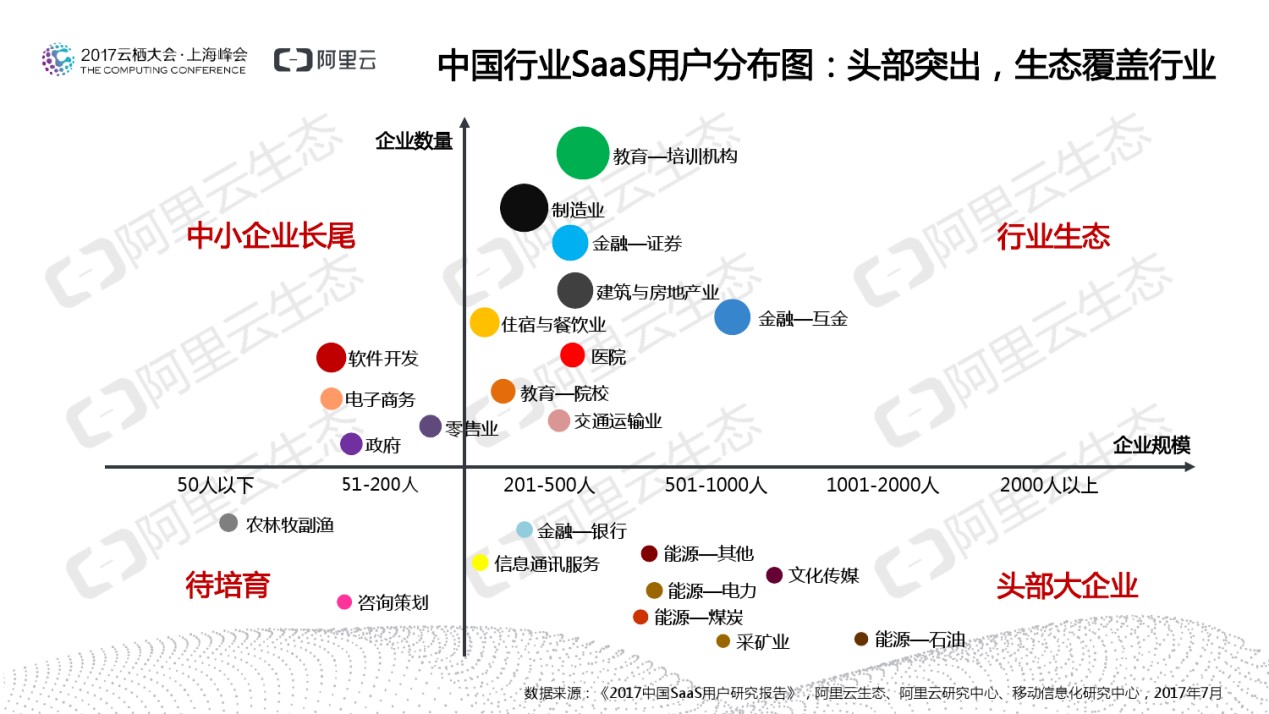 在阿里雲發佈的《2017中國SaaS用戶研究報告》10大趨勢中,提到2017年中國64.5%的SaaS用戶企業集中在金融、教育、製造、建築地產以及軟體開發等五大風口。