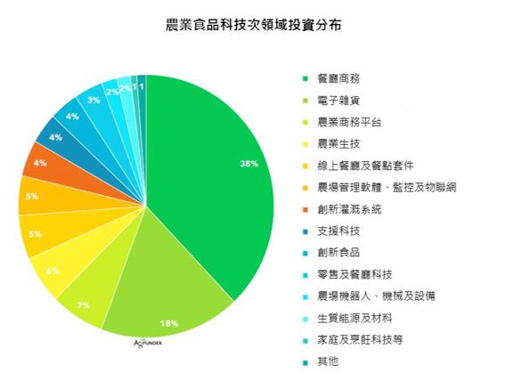 該報告所統計的農業食品科技(Agrifood tech)次領域包含:農業生技、農場管理軟體、監控及物聯網、農場機器人、機械及設備、生質能源及材料、創新灌溉系統、農業商務平台、支援科技、創新食品、零售及餐廳科技、電子雜貨(eGrocer)、餐廳商務、線上餐廳及餐點套件、家庭及烹飪科技等。