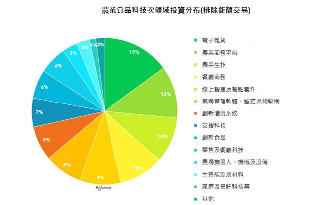 在2017年農業食品科技投資金額中,以餐廳商務所占比例最高,達38%,其次依序為電子雜貨(18%)、農業商務平台(7%)、農業生技(6%)等;若排除鉅額交易案,則前三大投資次領域依序為電子雜貨(15%)、農業商務平台(12%)、農業生技(10%)和餐廳商務(10%)。鉅額交易案包括: