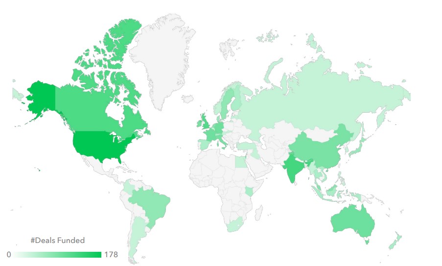 依地域分布來看,美國仍是農業食品科技交易最熱絡的地方,投資件數占全世界48%,投資金額占比為44%,居於首位,這對於具有健全新創生態系統的美國而言並不意外。然而美國之外的其他國家交易則有上升趨勢,如澳洲、法國、德國、愛爾蘭、馬來西亞,但仍以印度、加拿大和英國居前。