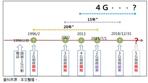 自民國1996年2月5日修正「電信法」後,政府即據以開放行動通信業務(第二代行動通信業務執照,或稱為GSM執照、2G執照),時至2017年6月底2G網路營運超過20年。另外,2002 年初舉行第三代行動通訊業務執照的競標,開放5張3G執照,計有中華電信、台灣大哥大、遠致電信(遠傳電信)、亞太行動寬頻等五家企業獲得執照。而3G服務的退場預計在2018年年末執行,整個3G業務期程則超過15年。