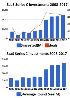 SaaS B輪的投資事件數在2015年達到高峰,此外金額除2016年有較明顯的下滑外,揭露金額呈現向上趨勢,同時在2017年創下近10年新高,這些都與A輪投資相似。