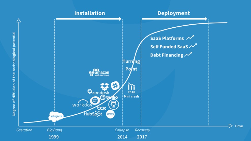 1999年可說為雲端SaaS領域的開端,其中Salesforce於此時成立,1999年至2014年為建置期,許多雲端運算企業相繼進入與成立,其中自然包含提供基礎建設的Amazon。2014年前後可說是技術潛力的爆發點,各類技術快速進入應用。而在2017年後,開始進入綜效與成熟期,SaaS領域從建置轉為部署。Point Nine Capital也預測將來SaaS領域企業將有以下三類現象,第一,SaaS平台的出現,SaaS領域企業將出現多個主要的服務提供平台,提供多種SaaS服務或與其他SaaS領域企業在資料與系統上的連接,無法與其他SaaS服務結合將成為資料或系統上的孤島;第二,SaaS新創企業將轉向以自籌為主,主要原因除了種子輪的資金趨勢明顯下滑外,SaaS領域也逐漸成為一個成熟的生態系,因此更有可能創造出足以自籌資金的公司;第三,債務融資事件增加,在早期資金趨緩及領域逐漸成熟下,新創企業及其投資人會被迫或更傾向轉往透過債務融資。