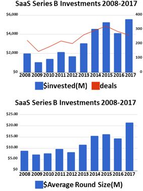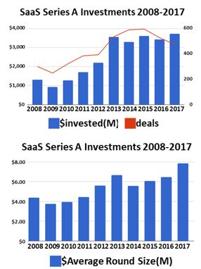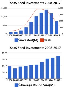 然而從平均獲投金額可以發現,從2009年後種子輪平均獲投金額是逐年增加的。這兩組數據較直覺的解讀方式,即是風險投資人對於SaaS領域處於種子輪前的新創企業投資雖然在近三年趨於保守,但隨時間所累積的經驗,平均投資金額則提高,此外,種子輪的平均獲投金額皆低於100萬美元,換言之,那些200萬至300萬甚至更高的離群值獲投企業,肯定具有吸引投資人目光的特質與表現。