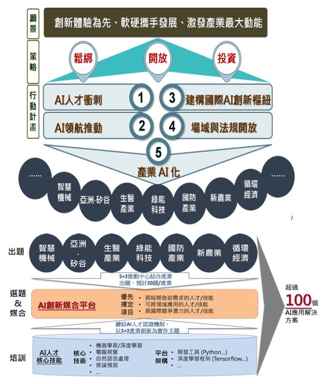 科技會報辦公室強調,未來「台灣AI行動計畫」將整合5+2產業創新方案,由5+2產業創新推動中心提出產業發展需求,再由相關部會協助發展100個以上的AI應用解決方案,透過鏈結AI人才認證機制,以5+2產業創新為實作主題,打造以5+2創新需求導向的人才培育與媒合機制,讓人才培育與產業需求能在第一時間接軌。此外,再透過推動國際旗艦公司設立AI研發中心,與台灣本土AI產業鏈結,促成國際合作,並推動中小企業參與,完善AI應用發展的支援環境,塑造台灣成為全球智慧科創新的重要樞紐。