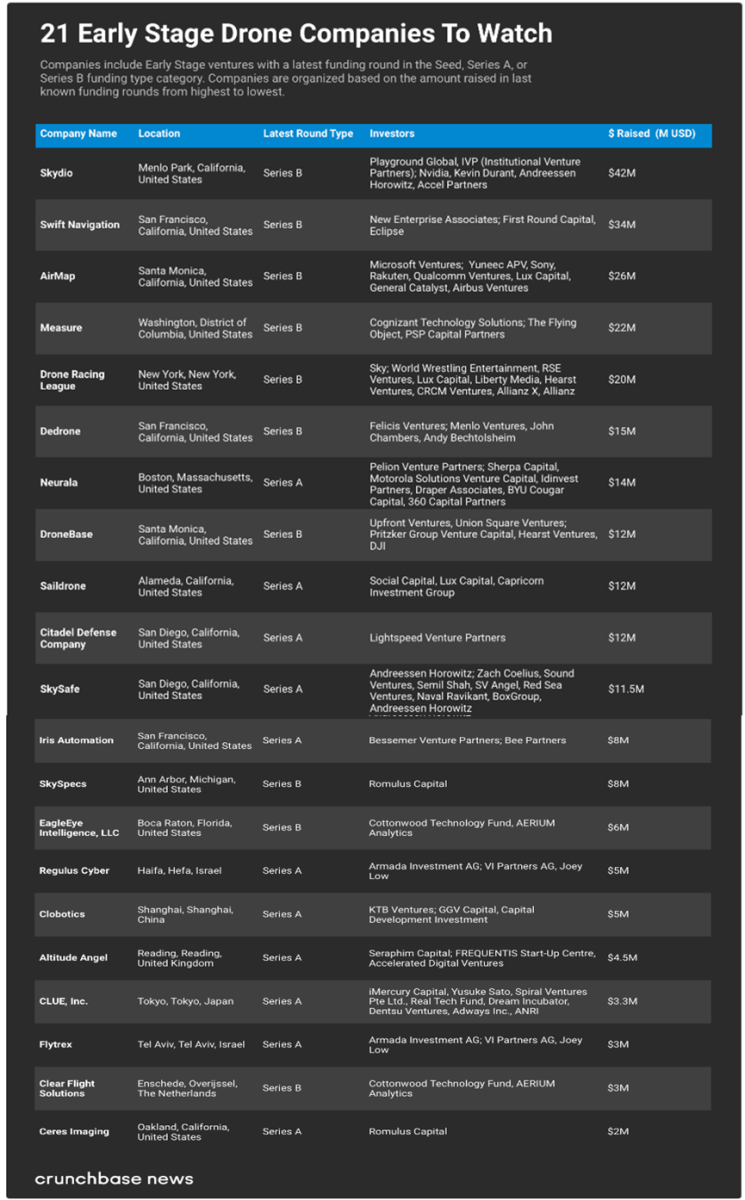 無人機領域的另一個著名公司是Skydio,該公司在2017年獲得由Playground Global、Institutional Venture Partners、Andreessen Horowitz和矽谷其他大型投資商共同投資的4,200萬美元的B輪投資。