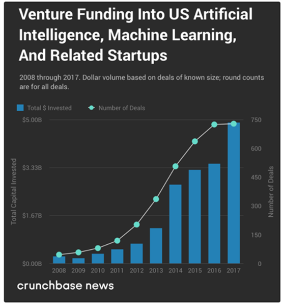 根據crunchbase的統計,美國AI與機器學習相關領域的新創獲投金額,從2014到2017年一路飆升,特別是在2017年的投資金額更較2016年成長40%,接近50億美元。唯2017年投資件數趨緩,約維持在740件左右,但這樣的趨勢未必是壞消息。