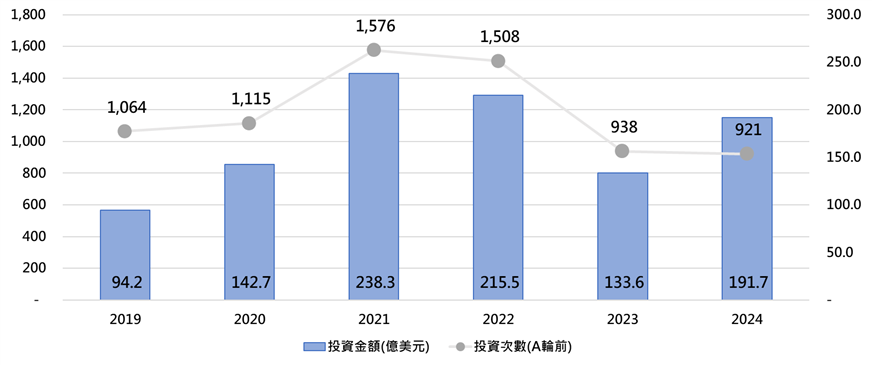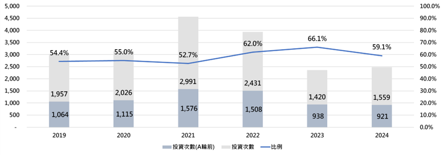 另一方面,觀察投資輪次結構數據,可以明顯看到在投資活動最活躍的2021年,反而A輪前投資占整體投資比例是近六年來最低,僅有52.7%,顯示該年度這60家創業投資機構的投資決策更偏向中後期投資,然而此一結構在2022年後翻轉,2022年至2024年A輪前投資占整體投資比例是近六年來前三高,隱含投資機構調整投資策略,重新布局年輕潛力新創的訊號。