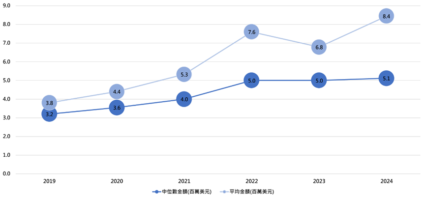 此外,高出場率的投資機構不斷墊高注資規模,使逐年投資中位數與平均數金額持續增高,在近年資金充沛的背景下,此一發展並不意外,而從2019年至2024年,投資中位數與平均數的大幅成長,更代表投資機構願意承受更大風險加大早期投資,此與近年來許多投資機構爭相競逐市場熱門標的有關。