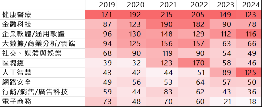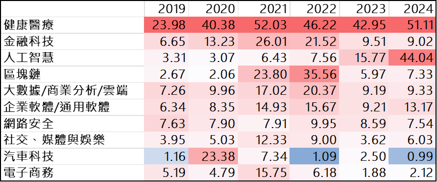 表2 前十大領域熱力圖(投資件數與投資金額)
