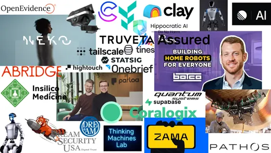 - OpenEvidence—專門為醫生開發一款人工智慧醫療搜尋引擎和生成式人工智慧聊天機器人,用於總結和簡化醫療資訊,2025年7月獲投2.1億美元,估值達35億美元