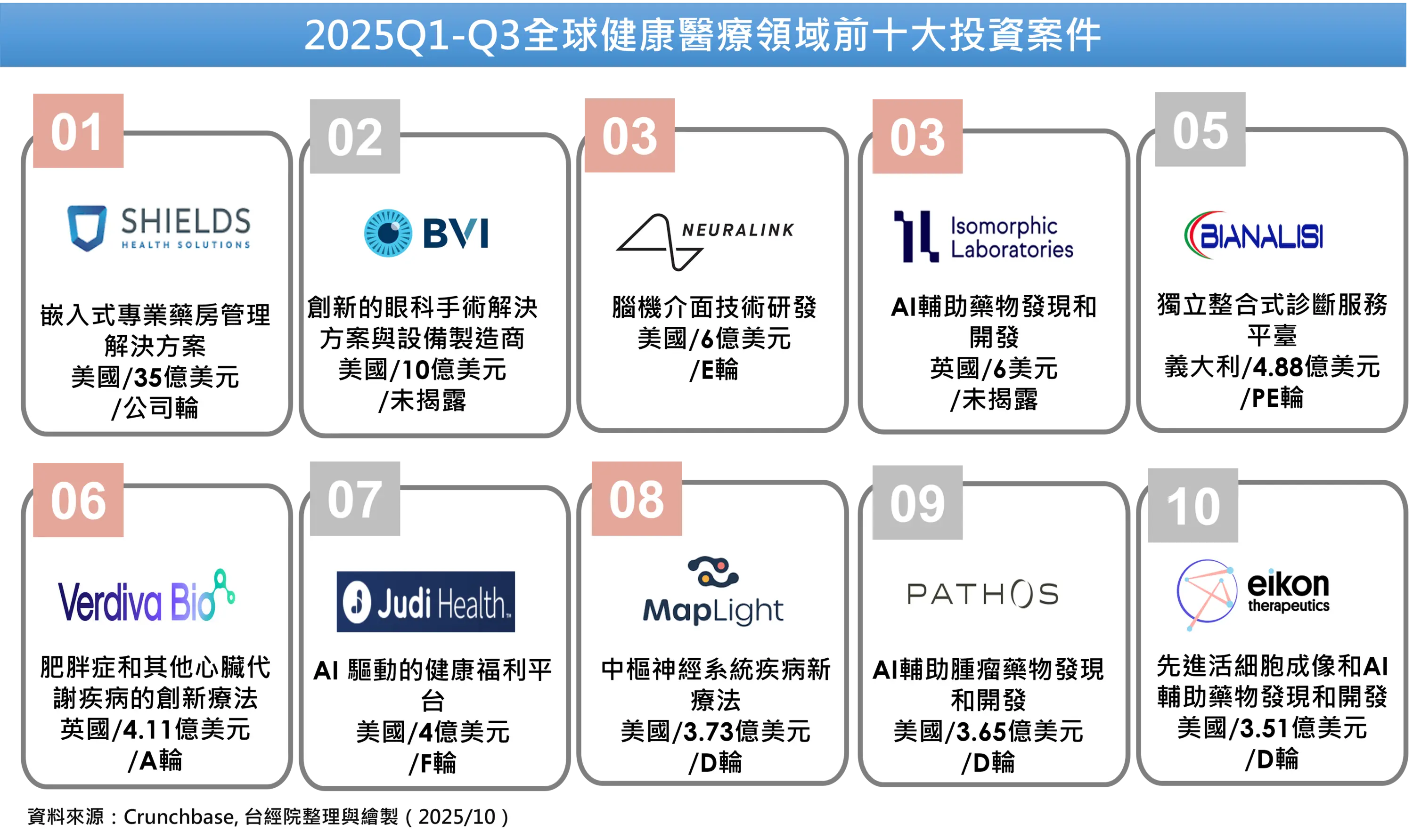 2025前三季全球健康醫療領域前十大投資案件中,最大一筆為35億美元,第二大為10億美元,入榜門檻為3.51億美元。比較罕見的是前二大非生技醫藥領域獲得,而是數位醫療與醫療器次領域。獲投金額第一大為美國專業藥房管理公司Shields Health Solutions獲得保險巨頭注資35億美元進而獨立發展。排名第二是美國創新眼科手術解決方案與設備製造商BVI Medical(10億美元)。第三名有兩家,分別是馬斯克共同創辦的腦機介面新創Neuralink(6億美元)與英國AI輔助藥物發現和開發新創Isomorphic Labs(6億美元)。第五大為義大利獨立整合式診斷服務平台Bianalisi的4.88億美元入榜。