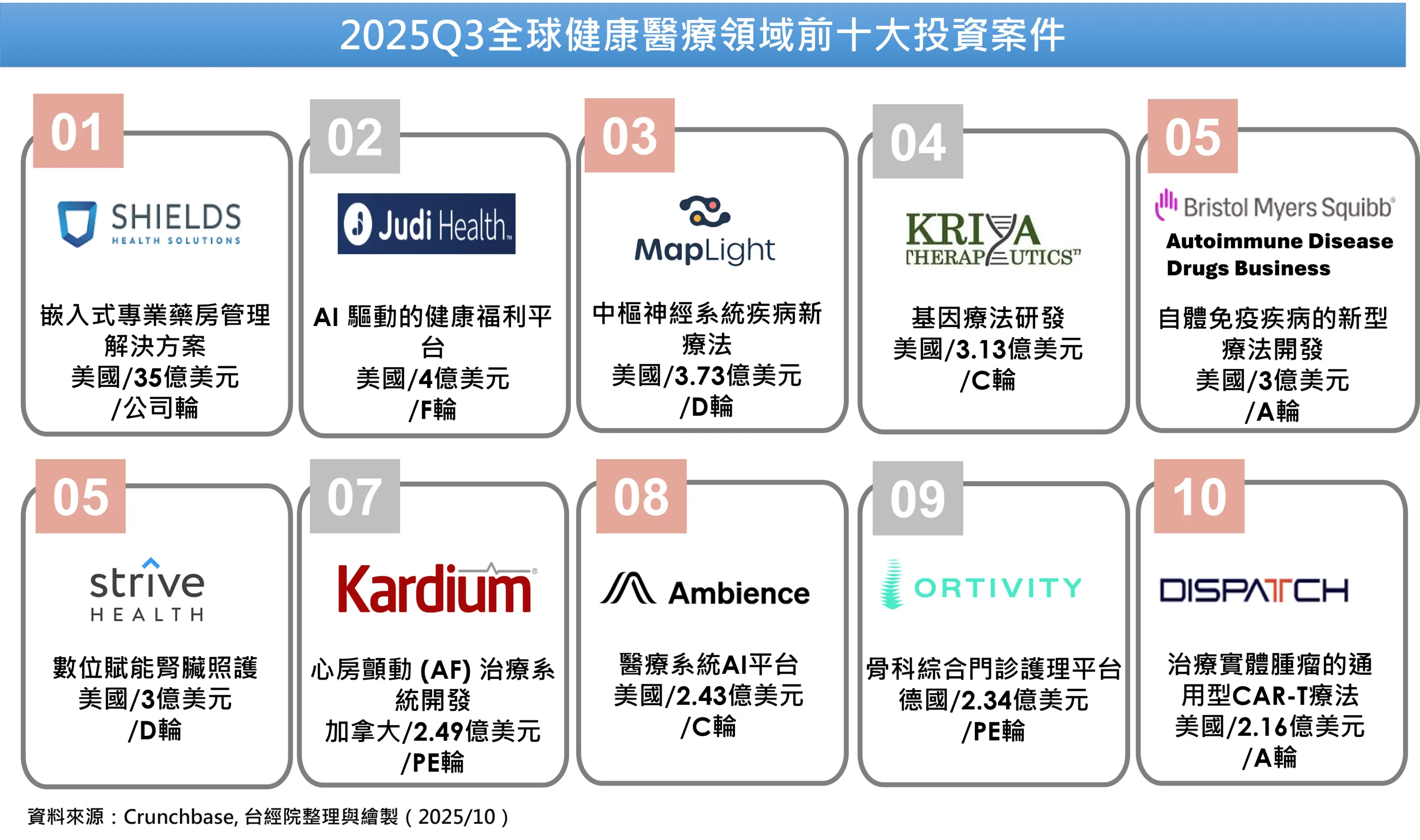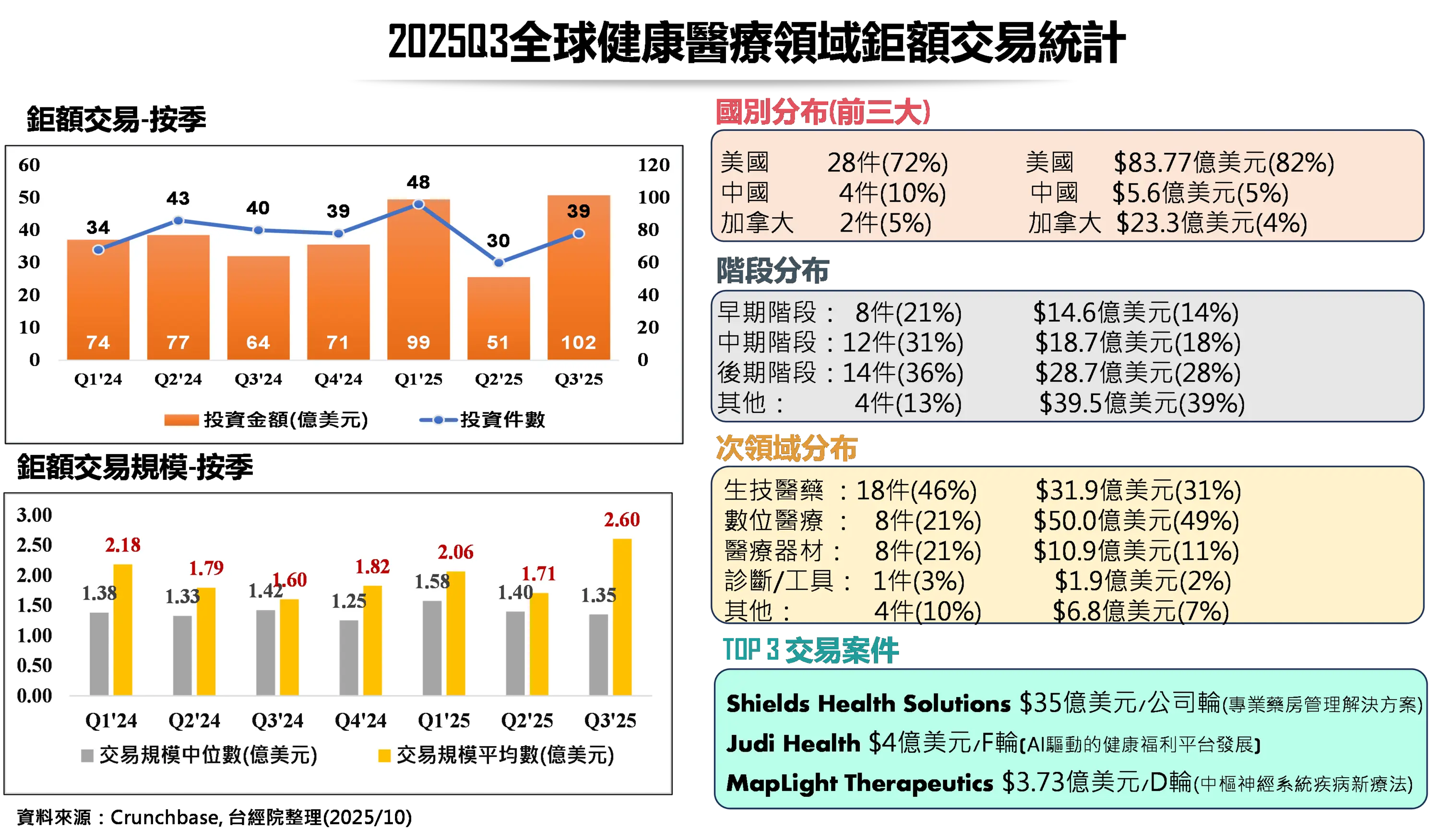 《重點1》2025Q3全球健康醫療領域前十大投資案件,由美國專業藥房管理公司Shields Health Solutions以35億美元領先