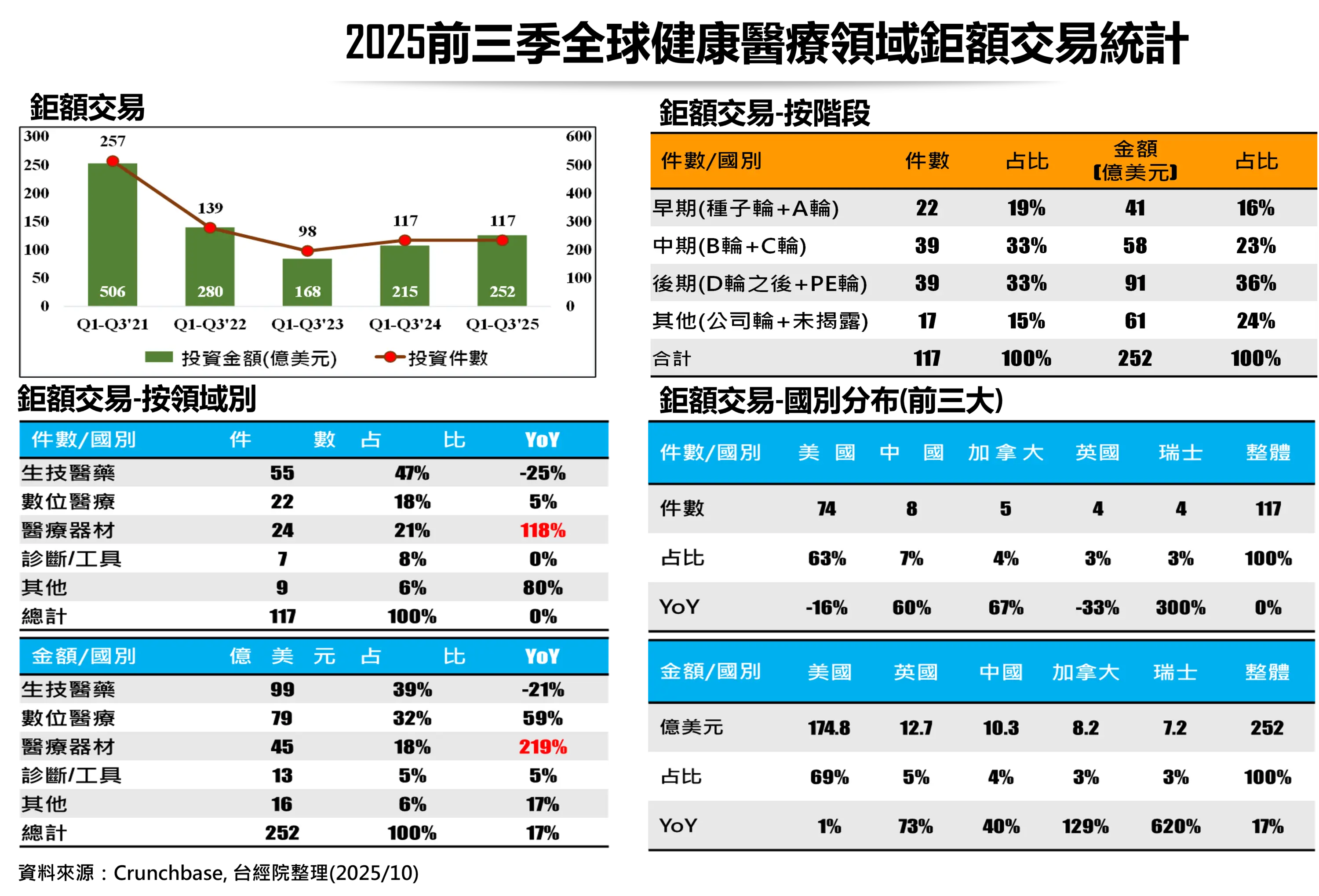 儘管面臨美國關稅、監管與醫療政策不確定性的因素衝擊下,2025年第三季次級市場的生技醫藥類股表現強勁,包括美國NASDAQ生技醫療類股指數(NBI)與中國A股及香港醫藥股都是漲聲不斷。2025年第三季全球健康醫療一級市場的鉅額投資也呈現「量穩值升」走勢,擺脫第二季投資驟降的陰霾。川普政府在10月宣布針對沒有在美國設廠的外國製藥品牌與專利藥課徵100%關稅,又擬推動打擊手段防堵中國正在崛起中的創新藥對美之商務拓展(Business Development, BD),勢必對近期陷入投資衰退的醫藥領域帶來衝擊。本文整理了2025年Q3最新健康醫療投資與併購數據,洞察次領域投資表現、重大投資與併購交易案例,並剖析美國政策環境如何牽動全球健康醫療生態鏈之布局,協助新創與投資決策者掌握產業發展脈動。