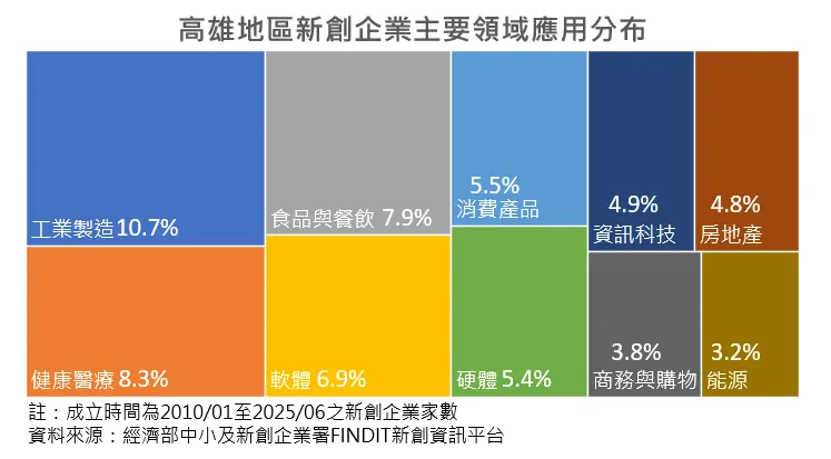 根據FINDIT資料庫統計,截至2025年6月底,臺灣新創企業已來到9,800家,其中,高雄市[1]之新創企業家數共764家,占全臺灣新創總數約7.8%,營運中[2]有710家。新創主要應用領域分布如下圖所示,主要應用領域以工業製造最多(10.7%),其次依序為健康醫療(8.3%)、食品與餐飲(7.9%)、軟體(6.9%)、消費產品(5.5%)、硬體(5.4%)、資訊科技(4.9%)、房地產(4.8%)、商務與購物(3.8%)、能源(3.2%)等。