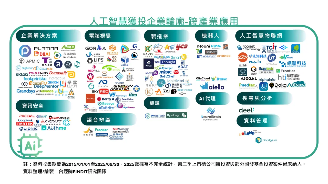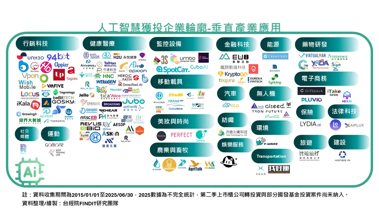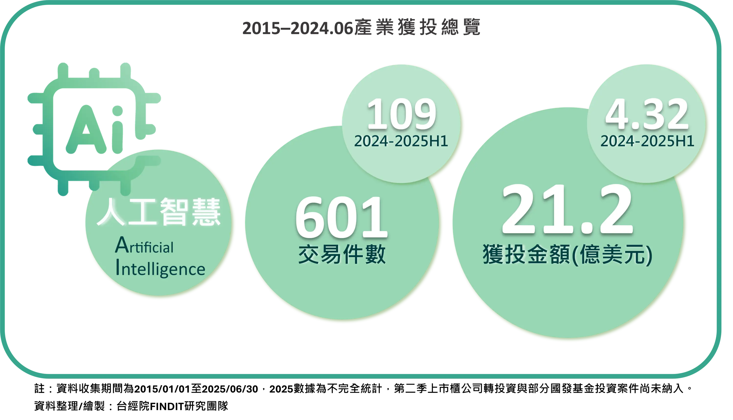 科技成長的速度迅雷不及掩耳,在快時代下生存,今天的突破稍不留神就可能被明天發表的技術取代,人工智慧從2023年開始吸引大量投資人的目光,漸漸地不單是學術界突破、產業間應用,人工智慧深入消費者端,成為家喻戶曉的技術工具;2024年,市場猜疑它是否會開始泡沫化,然而該領域新創在整體早期投資市場的獲投表現,以及不曾停歇的討論度已經將其正面駁回,「人工智慧能如何應用於產業」這句話從疑問句轉變成敘述句,有了市場積極評價的加持,大型模型以及基礎設施開發公司帶領人工智慧產業以飛快的速度成長,無論是橫向、垂直領域應用皆有新創企業大放異彩,到了2025年,圍繞著人工智慧技術的工具仍是大家口中的話題之一,持續推播的新創獲投消息也證實這股熱潮距離平息還很遠,隨著產業發展方向逐漸成熟,投資人資金挹注的目標也逐漸聚焦在特定層面,為了深入瞭解該領域的發展與投資樣貌,本文盤點全球趨勢,並根據2015年至2025年6月台經院FINDIT資料庫整理之臺灣企業獲投資料,為您獻上產業發展方向與資金佈局。
