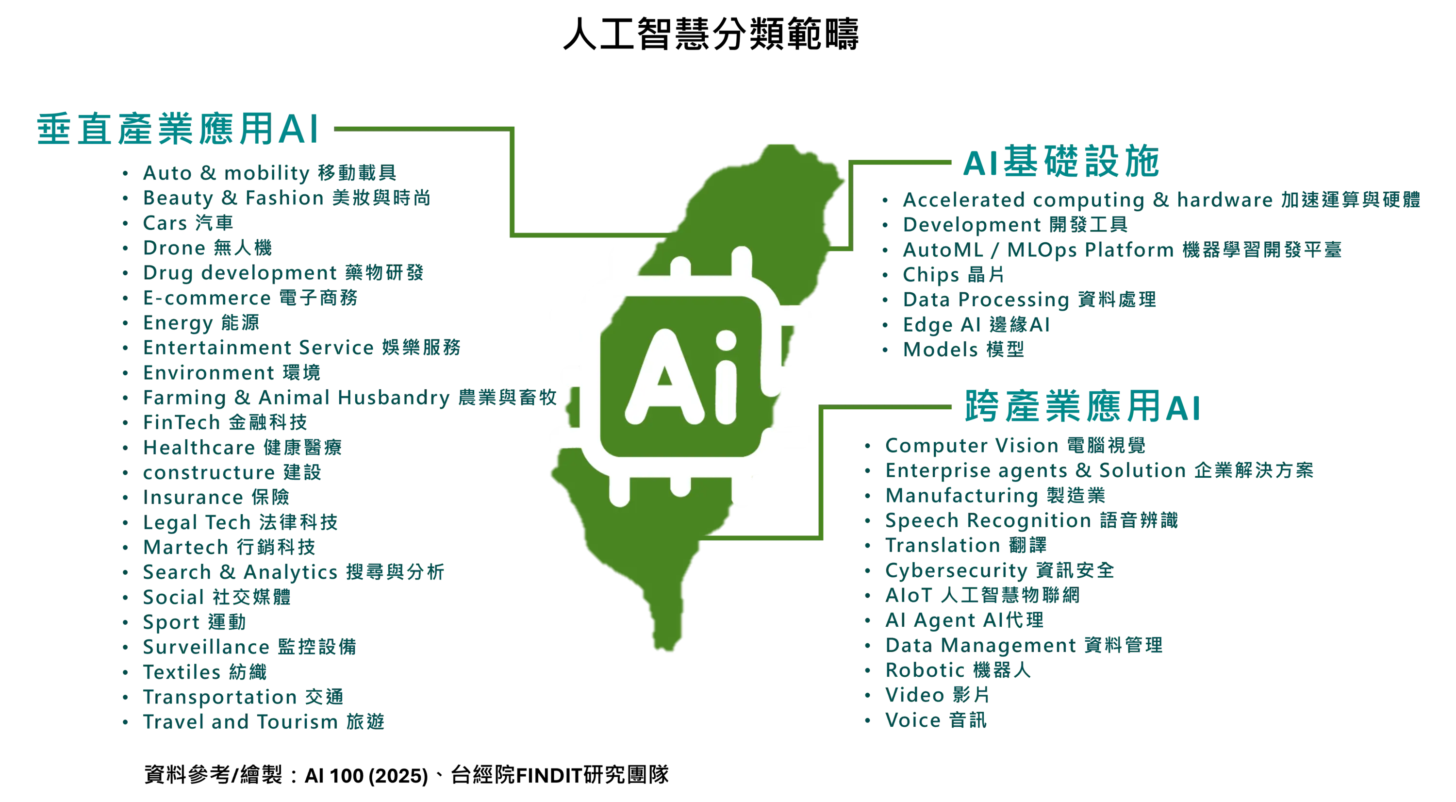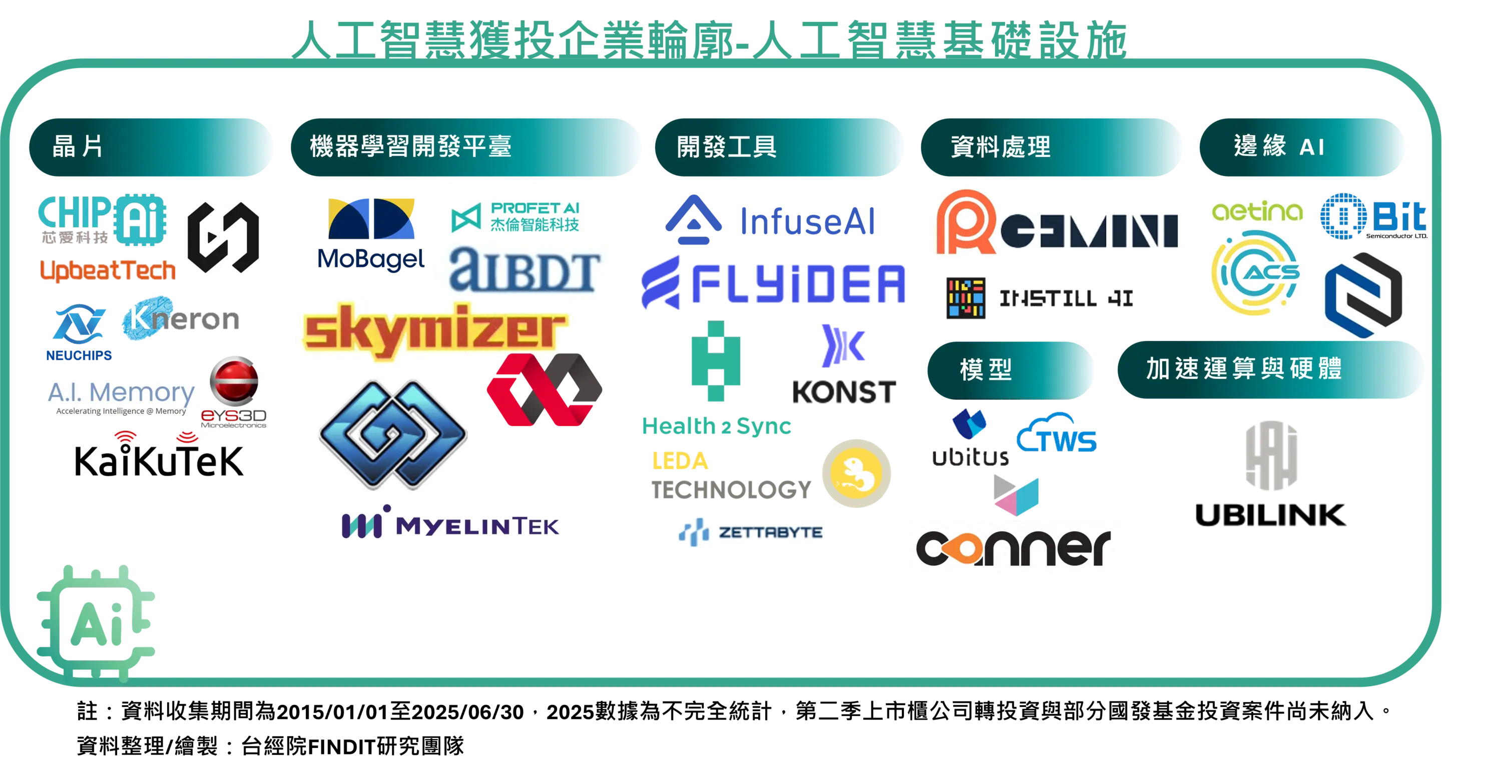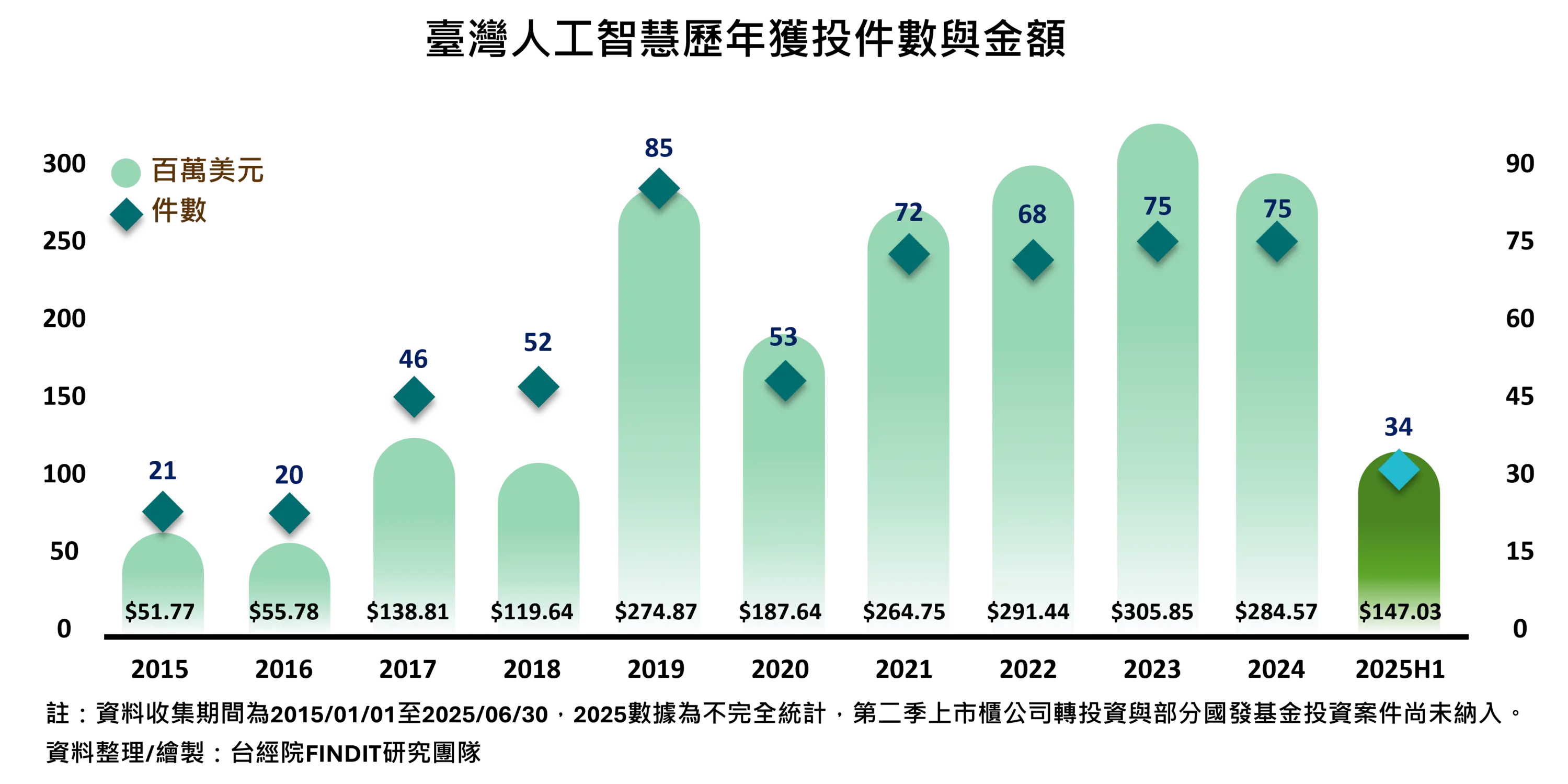 科技成長的速度迅雷不及掩耳,在快時代下生存,今天的突破稍不留神就可能被明天發表的技術取代,人工智慧從2023年開始吸引大量投資人的目光,漸漸地不單是學術界突破、產業間應用,人工智慧深入消費者端,成為家喻戶曉的技術工具;2024年,市場猜疑它是否會開始泡沫化,然而該領域新創在整體早期投資市場的獲投表現,以及不曾停歇的討論度已經將其正面駁回,「人工智慧能如何應用於產業」這句話從疑問句轉變成敘述句,有了市場積極評價的加持,大型模型以及基礎設施開發公司帶領人工智慧產業以飛快的速度成長,無論是橫向、垂直領域應用皆有新創企業大放異彩,到了2025年,圍繞著人工智慧技術的工具仍是大家口中的話題之一,持續推播的新創獲投消息也證實這股熱潮距離平息還很遠,隨著產業發展方向逐漸成熟,投資人資金挹注的目標也逐漸聚焦在特定層面,為了深入瞭解該領域的發展與投資樣貌,本文盤點全球趨勢,並根據2015年至2025年6月台經院FINDIT資料庫整理之臺灣企業獲投資料,為您獻上產業發展方向與資金佈局。