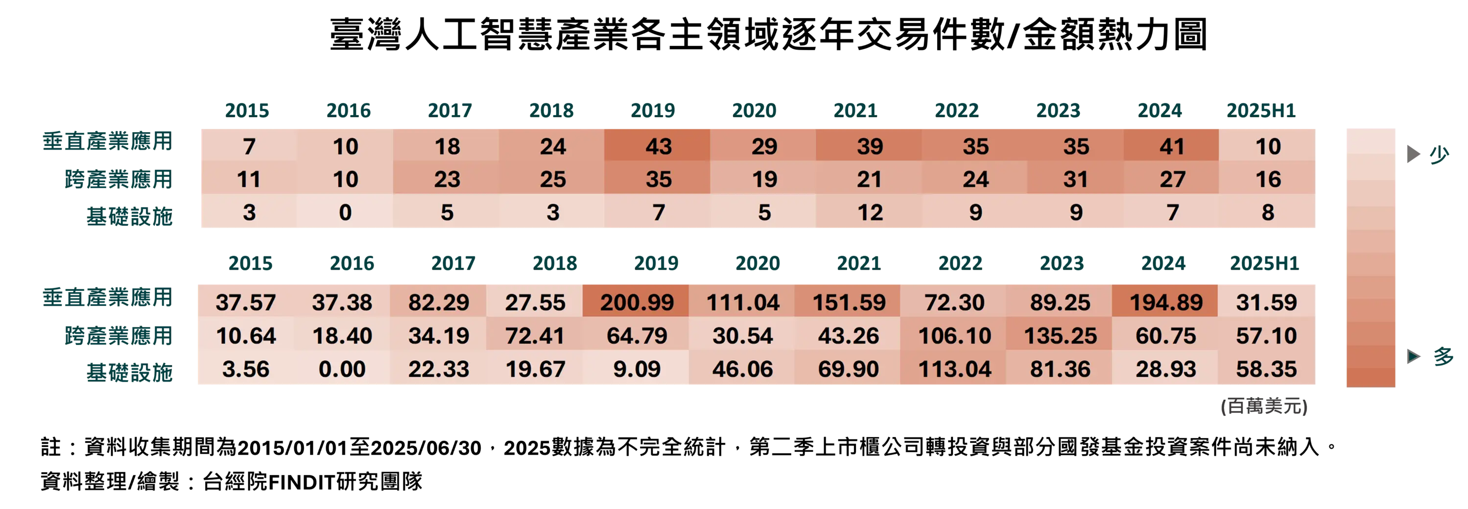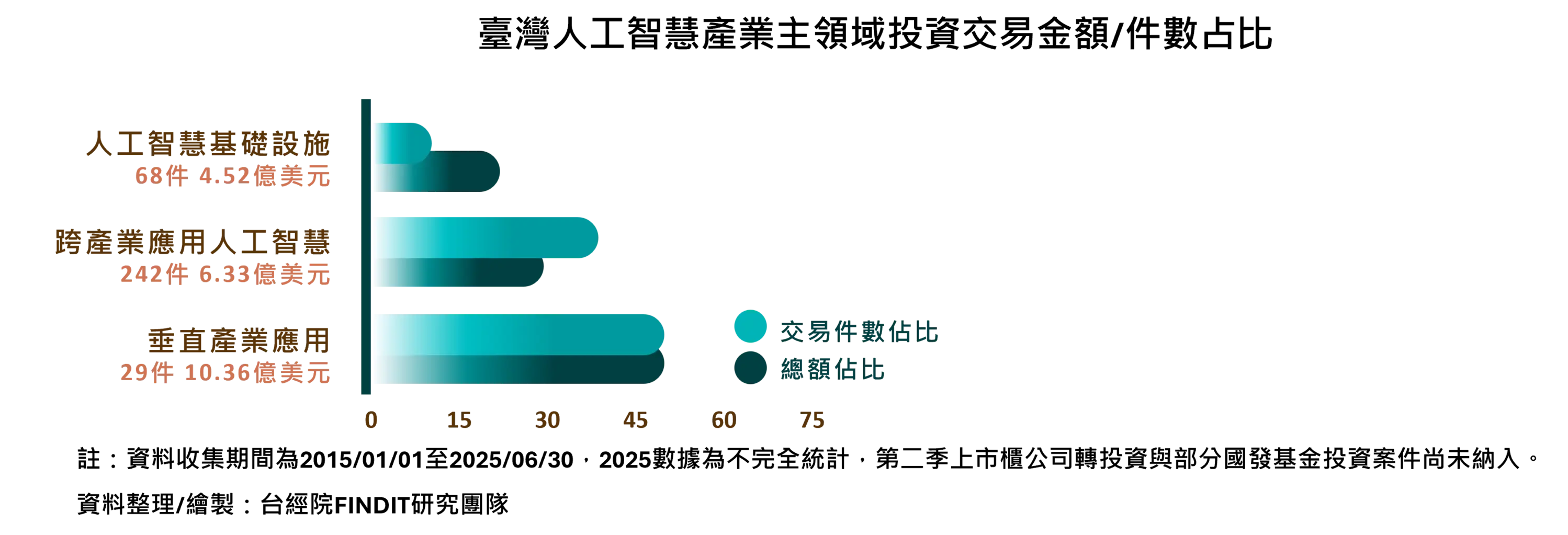 全球人工智慧投資交易在寒風中維持熱度,臺灣早期投資交易部份,FINDIT研究團隊彙整2015年至2025年第二季人工智慧領域交易件數則有601筆,占整體13.04%;投資金額為21.2億美元,占整體的11.16%。與2024年相比,交易件數和投資金額都有一定幅度的成長,隨著人工智慧產業的輪廓及應用越發完整,獲投金額的分布也與去年有異,整體而言,人工智慧產業仍在臺灣投資市場占有一定份量,在這之中,「垂直產業應用」貢獻的投資金額(10.4億美元)及筆數(291件)最多。