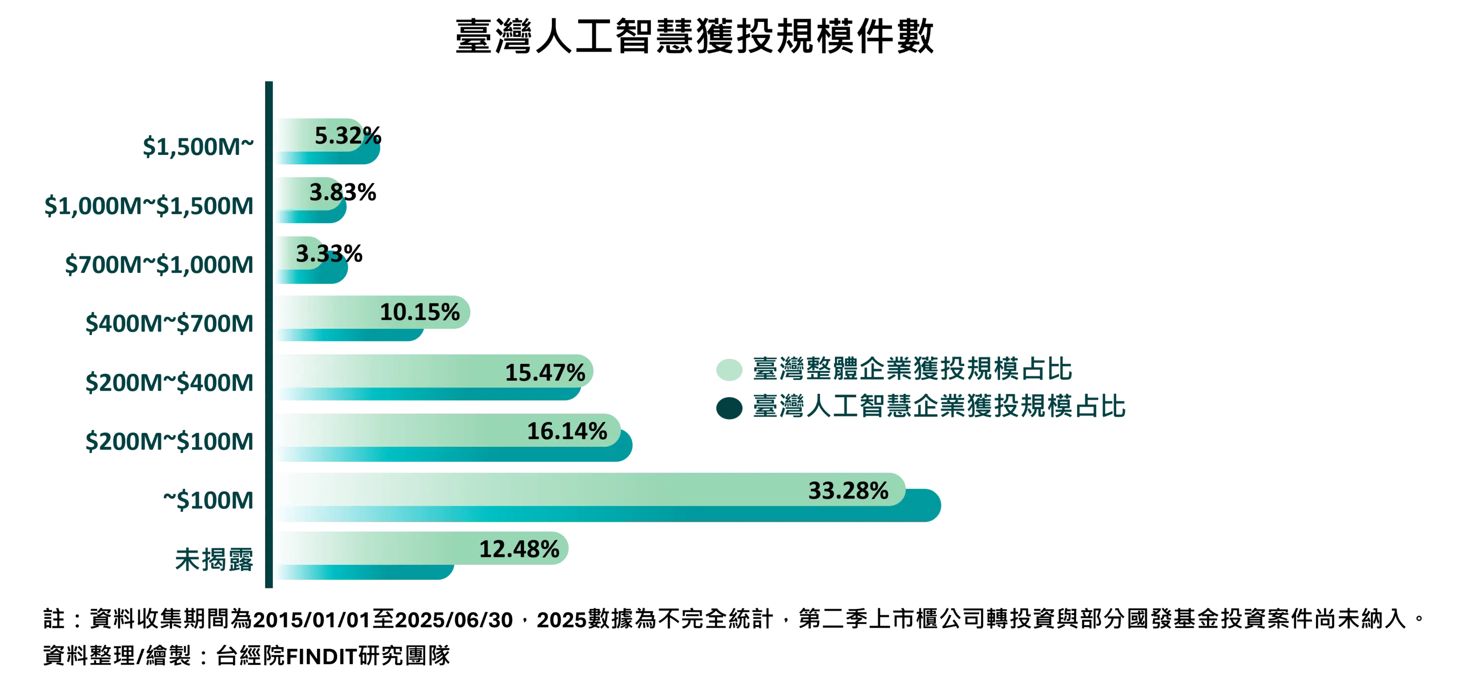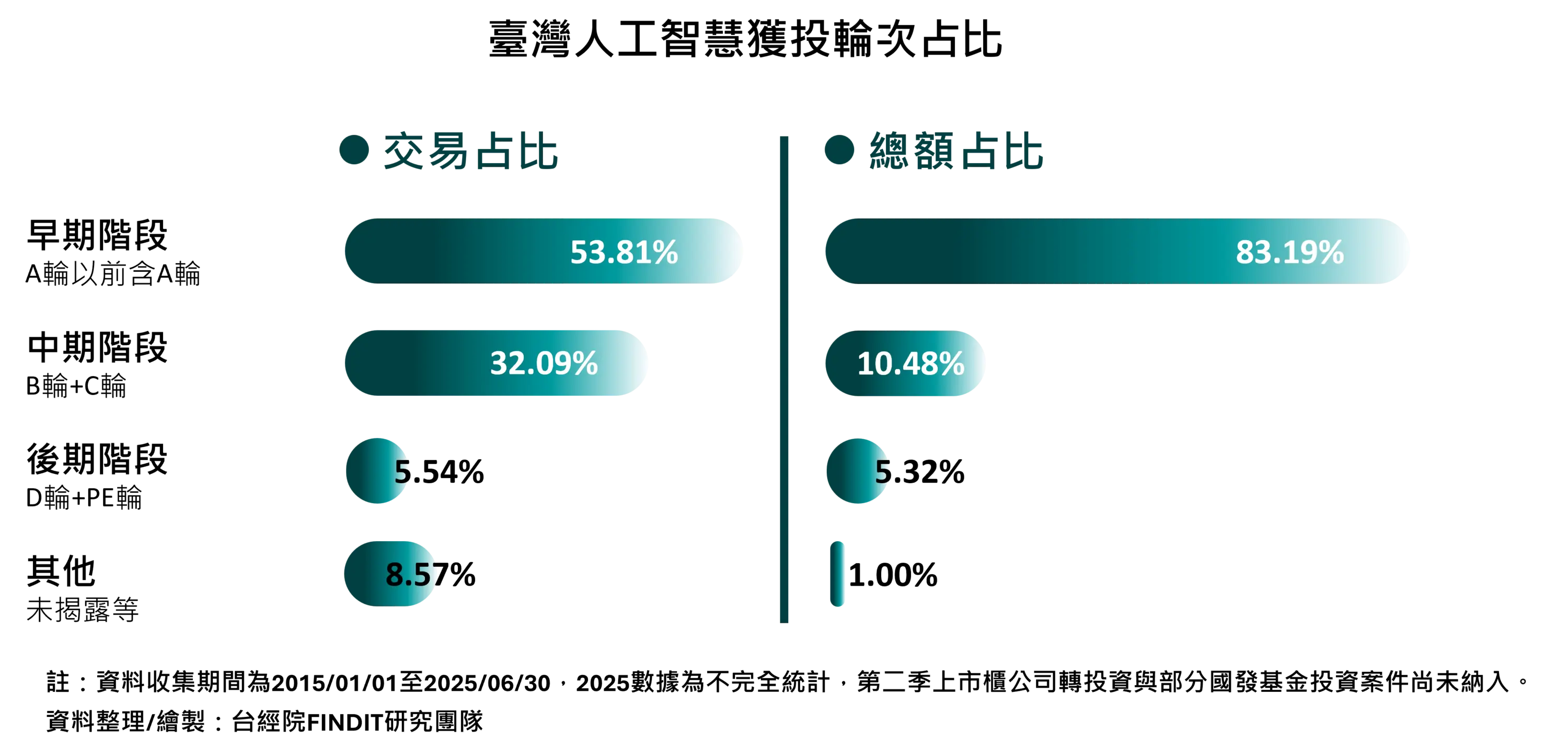 以歷年投資概況來說,臺灣人工智慧產業緊跟全球趨勢的腳步,資金挹注力道並未衰退,接著,將2015年至2025年6月的投資交易逐筆按輪次及交易金額規模做區分,瞭解企業獲投階段及資金規模分佈。從獲投階段可以看出人工智慧的交易件數多集中在早期階段(A輪、A輪前),比重達83.19%,其次的中後期階段(B、C、D輪)比例相對較少;若以各階段的獲投金額來看,早期階段占53.81%,中期階段則占32.09%,在中期階段因企業多有較明確的長遠目標及產品服務的規劃,單筆獲投的金額也將跟著成長。