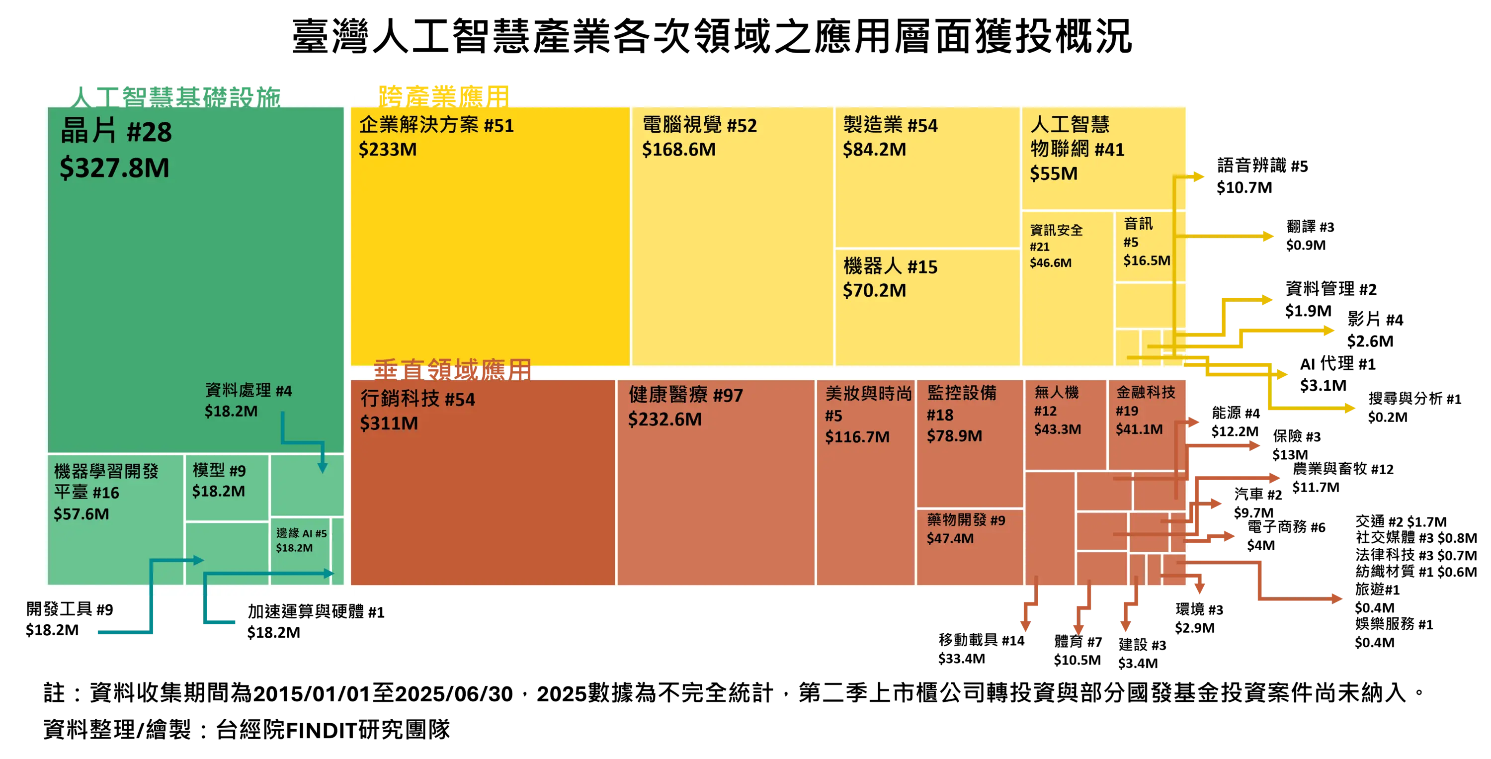 為進一步瞭解臺灣人工智慧產業獲投樣貌,基於台灣經濟研究院FINDIT研究團隊的整理,繪製整體獲投企業輪廓。